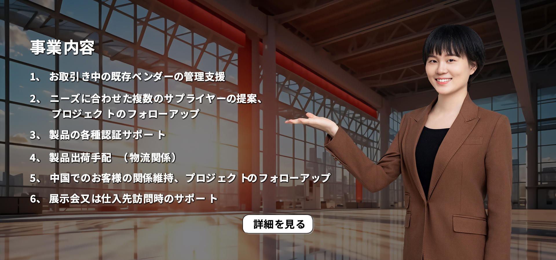 海外のお客様向けに、中国国内で既に取引されているベンダー様の管理支援や、 ニーズに合わせた新しいサプライヤーの提案、 プロジェクトフォローなどのビジネスサポートサービスを提供しています。